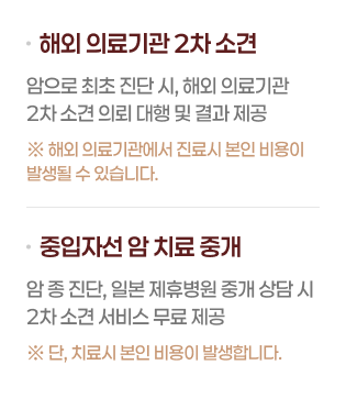Ư¾àÀÇ º¸Çè±â°£ Áß ¾Ïº¸Àå°³½ÃÀÏ (´Ù¸¸, ¡°±âŸÇǺξϡ±, ¡°°©»ó¼±¾Ï¡±, ¡°´ëÀåÁ¡¸·³»¾Ï¡±, ¡°Á¦ÀÚ¸®¾Ï¡± ¶Ç´Â ¡°°æ°è¼ºÁ¾¾çÀÇ °æ¿ì º¸Àå°³½ÃÀÏ) ÀÌÈÄ¿¡ "À¯¹æ¾Ï", "Àü¸³¼±¾Ï¡±, ¡°±âŸÇǺξϡ±, ¡°°©»ó¼±¾Ï¡±, ¡°Á¦ÀÚ¸®¾Ï", "°æ°è¼ºÁ¾¾ç" ¹× "´ëÀåÁ¡¸·³»¾Ï" Áß ÇѰ¡Áö·Î ÃÖÃÊ Áø´Ü È®Á¤µÇ°í, ±× ÇØ´ç ¾ÏÀÇ ÃÖÃÊ Áø´Ü È®Á¤µÈ ³¯·ÎºÎÅÍ ÀÌÈÄ ¸Å 1³â¸¶´Ù µµ·¡ÇÏ´Â Áø´ÜÈ®Á¤ÀÏÀÇ Àü ÀϱîÁö, ¡°À¯¹æ¾Ï¡±, ¡±Àü¸³¼±¾Ï¡±, ¡±±âŸÇǺξϡ±, ¡±°©»ó¼±¾Ï¡±, ¡±Á¦ÀÚ¸®¾Ï¡±, ¡±°æ°è¼ºÁ¾¾ç¡± ¹× ¡±´ëÀåÁ¡¸·³»¾Ï¡±ÀÇ Á÷Á¢ÀûÀÎ Ä¡·á¸¦ ¸ñÀûÀ¸·Î "¾Ï ¼ö¼ú", "Ç׾Ͼ๰ġ·á", "Ç׾Ϲæ»ç¼±Ä¡·á" Áß ¾î´À ÇϳªÀÇ Ä¡·á¸¦ ¹ÞÀº °æ¿ì (´Ù¸¸, ÃÖÃÊ Áø´ÜÈ®Á¤ÀϷκÎÅÍ, ÃÖ´ë 5³â°£ ¸Å³â 1ȸ Çѵµ·Î Áö±Þ(ÃÖ´ë 5ȸ Áö±Þ)) |